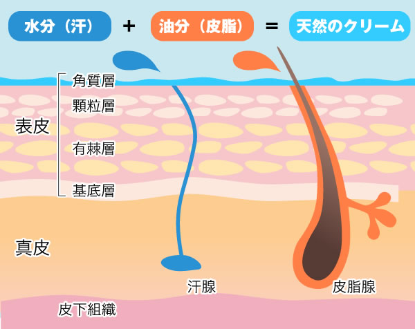 本来、汗は水分として、皮脂は油分として、皮膚を守る皮脂膜とよばれる天然のクリームを構成します。 この天然のクリームは、乾燥や外部からの刺激から肌を守る大切な分泌物なのです。